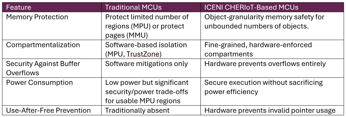 Iceni improves security over a traditional MCU because it integrates hardware-enforced memory safety and compartmentalization at the instruction set level. This makes it inherently resistant to memory corruption attacks, providing strong isolation between components, and reducing reliance on complex software mitigations—all with lower overhead and improved assurance.